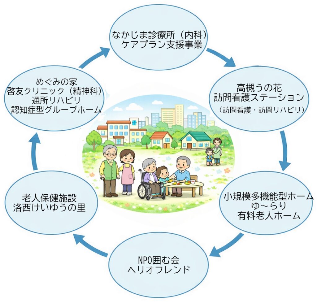 2000年の介護保険のはじまる前に、孤立しがちな高齢者が共に集まり語り合い励ましあう場「老人デイケア(通所リハビリ)」を開設し、その後 認知症型グループホームなど、介護事業もはじめ、続けて、京都・洛西に、老人保健施設も開設しました。