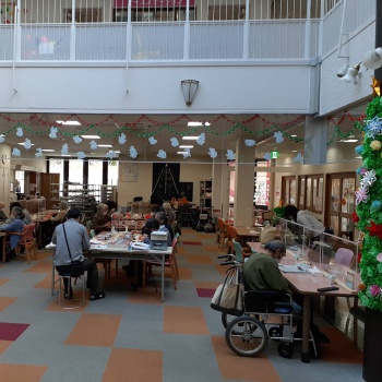 おしゃべりのお好きな方は食堂のテーブルでワイワイと。