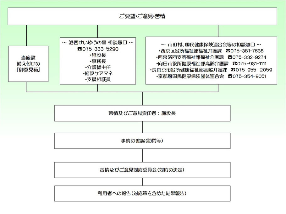 ◎利用者様又はその方の身元引受人様は、提供されたサービス等に苦情がある場合はいつでも『施設利用約款』記載の苦情申立窓口に苦情を申し立てる事が出来ます。その場合、当施設は速やかに事実関係を調査し、その結果並びに、改善の必要性の有無、及び改善の方法について申立者に報告致します。